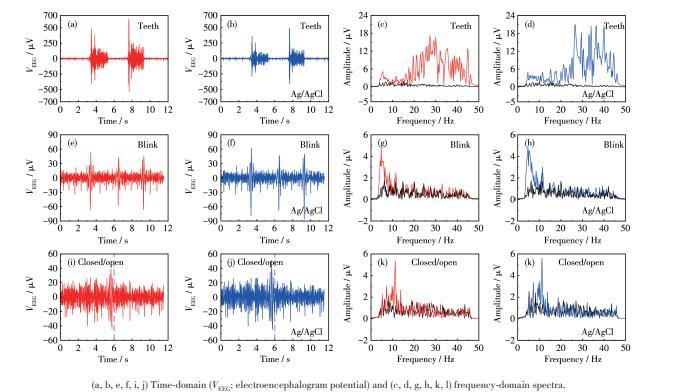 圖4使用Cu2O/Cu‐VG微電極(紅)和商用Ag/AgCl電極(藍)同步記錄的肌電、眼電及腦電信號的時域譜和頻域譜:(a~d)咬牙范式下記錄的肌電信號、(e~h)眨眼范式下記錄的眼電信號、(i~l)閉眼/睜眼范式記錄的腦電信號