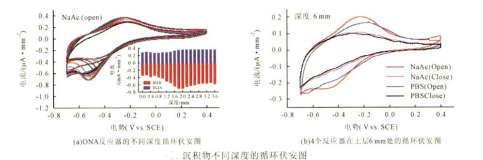 循環(huán)伏安(CV)結(jié)果顯示(圖3),在ONA反應(yīng)器中,隨著深度的增加,F(xiàn)e*的還原峰值先是增加,在約20mm處增加到最大,然后緩慢下降。氧化峰是逐漸增加的,其變化不明顯。原因分析,由于天然微生物燃料電池效應(yīng),使得1.5~2.0mm處的微生物活性更高,從而產(chǎn)生更多的Fe離子,而深層Fe*還原峰值下降是因?yàn)椋嚯x上層溶解氧較遠(yuǎn),傳輸電子速率下降,因而影響了微生物的活性。這與pH、O2微電極結(jié)果的實(shí)質(zhì)是一致的。這也進(jìn)一步說明土柱的中間層變黑(圖1)的原因,即Fe*在厭氧區(qū)擴(kuò)散,與硫化氫發(fā)生反應(yīng),產(chǎn)生FeS沉淀。Risgaard-Petersen等研究表明,土層中的游離Fe主要來自FeS的溶解,其溶解率為(5.9±0.7)mmol/(m2·d)(以Fe計(jì))。當(dāng)Fe*在厭氧區(qū)擴(kuò)散,與硫化氫發(fā)生反應(yīng),即產(chǎn)生FeS沉淀;當(dāng)Fe*往好氧區(qū)擴(kuò)散,與O,發(fā)生反應(yīng),產(chǎn)生Fe(OH)沉淀。本實(shí)驗(yàn)結(jié)果,在ONA反應(yīng)器的液面上也發(fā)現(xiàn)少量的黃色物質(zhì)(圖中未顯示),推測是Fe(OH)沉淀。