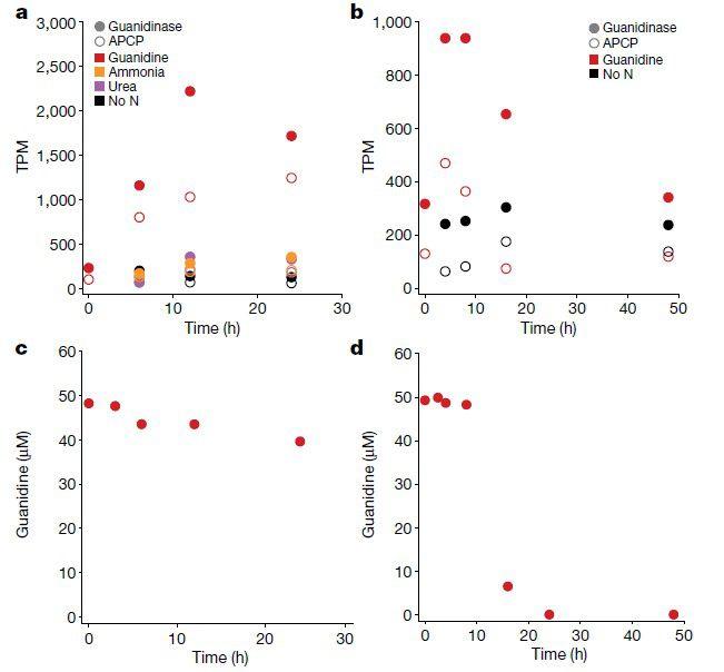 圖5、a、b)來自Ribe(a)和Haderslev(b)污水處理廠的大量comammox生物體中,胍APC超家族通透酶(APCP)和胍酶對底物加標(胍、銨、尿素)孵育的轉錄反應。Ribe和Haderslev實驗的宏轉錄組讀數分別映射到Ribe和Haderslev comammox MAG;TPM中顯示了所有時間點感興趣基因的轉錄水平。c、d,Ribe(c)和Haderslev(d)采樣時用于宏轉錄組學的重復中相應的胍濃度。