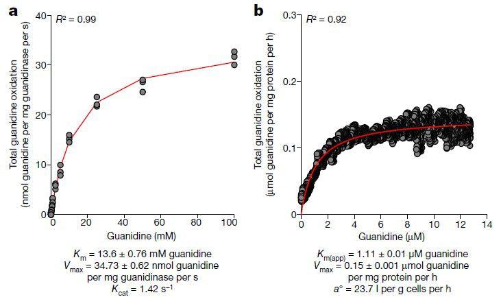 圖4、純化的胍酶和N.inopinata細胞的胍氧化動力學。a,異源表達的N.inopinata胍酶的動力學特征。Michaelis-Menten模型(紅線)適合胍酶(pH 7.5,37°C)的三次胍消耗率,并用于確定K m和V max。b,用微傳感器測量用胍預誘導約12小時的細胞,確定N.inopinata的全細胞胍氧化率。Michaelis-Menten模型(紅線)用于根據胍氧化速率確定表觀半飽和常數(K m(app))、V max和底物特異性親和力。