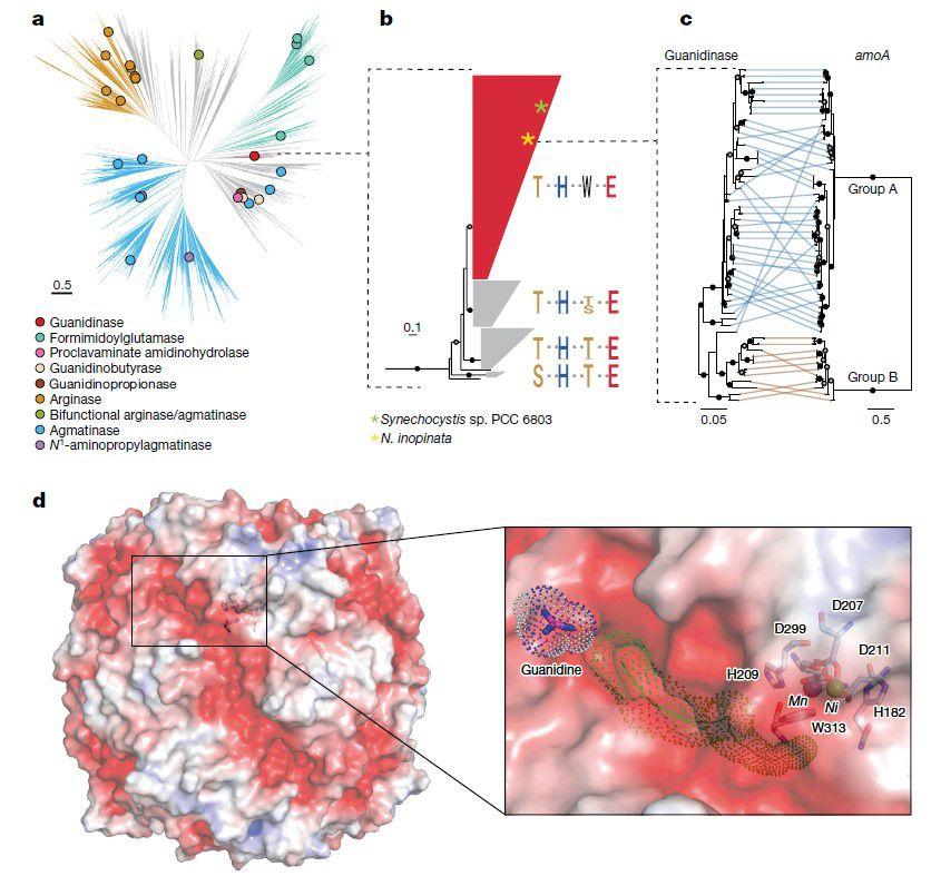 圖2、comammox胍酶的系統發育和結構。a,尿素水解酶超家族的系統發育。圓圈表示具有功能特征的成員。所表征的N 1-氨基丙基胍丁胺酶包含在指定的胍丁胺酶進化枝中。灰色分支不對應于任何已知的功能,或者對于功能來說不是單系的。b,簡化的胍酶系統發育,使用生化特征的精氨酸酶家族成員作為外群(擴展數據圖4a中顯示了完整的樹)。根據先前的研究(N.inopinata胍酶位置Thr105、His222、Trp313和Glu344;補充表4),顯示了可能對胍催化重要的特定氨基酸殘基。c,comammox胍酶(氨基酸)和氨單加氧酶(amoA核苷酸)的系統發育關系的比較。同一基因組中發現的基因的樹尖相連。d,胍丁酶的靜電表面表示(從?5 kT/e(紅色)到+5 kT/e(藍色)),其中突出顯示了通往活性位點的隧道的建議入口(左)。右圖是方框所示區域的放大圖。由CAVER 57確定的隧道顯示為綠線,其寬度由點表示表示。活性位點殘基顯示為棒,鎳(Ni)和錳(Mn)離子分別顯示為綠色和紫色球體。胍顯示為棒,相應的范德華原子半徑表示為點。