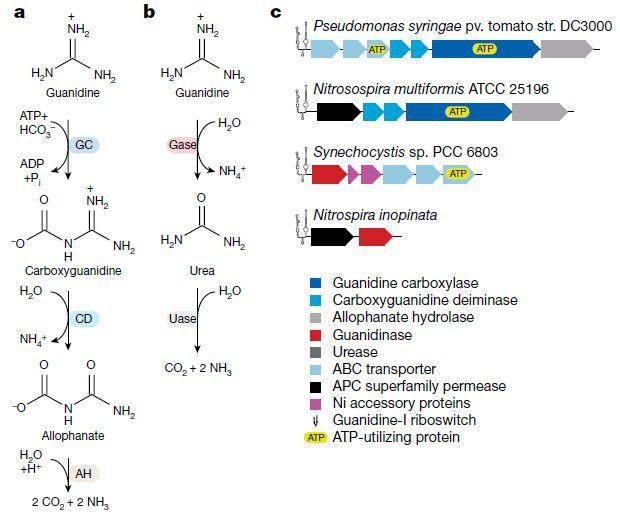 圖1、胍降解所涉及的途徑和基因。a)胍羧化酶途徑。AH,脲基甲酸酯水解酶;CD,羧基胍脫氨酶;氣體、胍酶;GC,胍羧化酶;P i,無機磷酸鹽;用途,脲酶。b)胍酶途徑。c)在comammox微生物N.inopinata、AOB Nitrosospira multiformis和兩種用于胍分解代謝的細菌模型生物中,編碼參與在I型胍核糖開關調節下的胍降解的蛋白質的基因的排列。