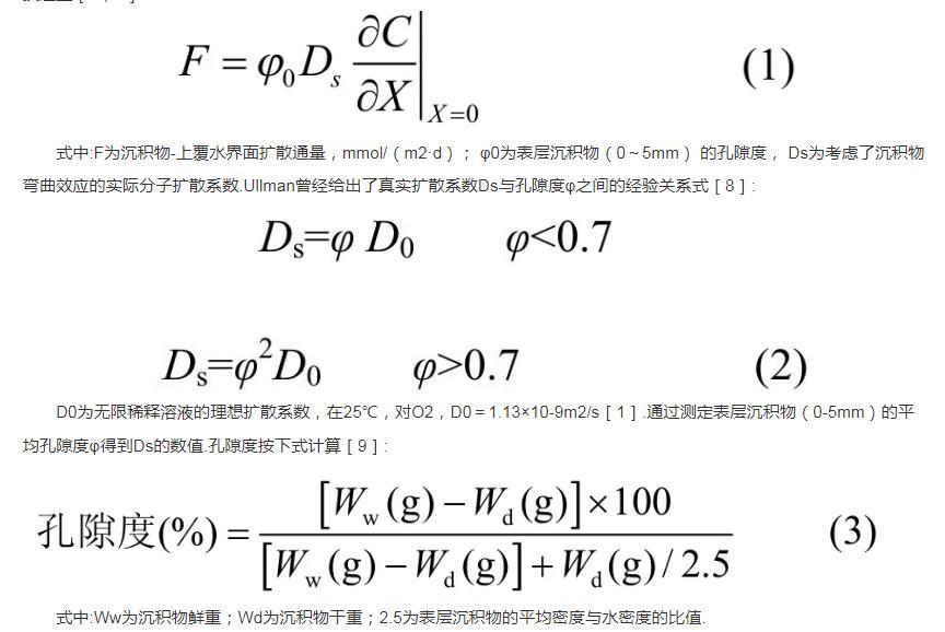 式中:F為沉積物~上覆水界面擴(kuò)散通量,mmol/(m2·d);φ0為表層沉積物(0——5mm)的孔隙度, Ds為考慮了沉積物彎曲效應(yīng)的實(shí)際分子擴(kuò)散系數(shù)。Ullman曾經(jīng)給出了真實(shí)擴(kuò)散系數(shù)Ds與孔隙度φ之間的經(jīng)驗(yàn)關(guān)系式: