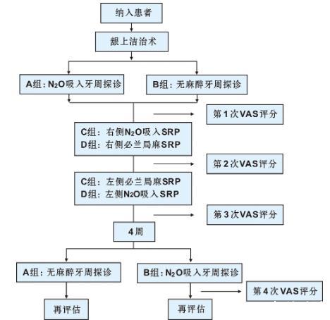在SRP治療階段,實(shí)施雙側(cè)分區(qū)治療。將納入患者隨機(jī)分為2組:C組第一次SRP治療為右側(cè)半口區(qū)域,在50%一氧化二氮+50%氧氣吸入麻醉下使用超聲齦下刮治器(EMS,瑞士)及手動(dòng)Gracy齦下刮治器(Hu-Friedy,美國(guó))進(jìn)行齦下刮治根面平整;D組第一次SRP治療為右側(cè)半口區(qū)域,在齦頰溝處局部浸潤(rùn)麻醉下(必蘭,法國(guó))使用超聲齦下刮治器(EMS,瑞士)及Gracy齦下刮治器(Hu-Friedy,美國(guó))進(jìn)行。第二次SRP治療,C組左側(cè)半口區(qū)域?qū)嵤l頰溝局部浸潤(rùn)麻醉下SRP;D組左側(cè)半口區(qū)域?qū)嵤?0%一氧化二氮+50%氧氣吸入麻醉下齦下SRP。治療全程使用心電監(jiān)護(hù)儀記錄實(shí)時(shí)血壓狀況。
