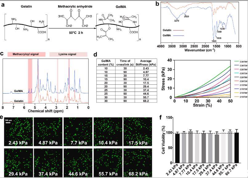 圖1、具有不同硬度的GelMA水凝膠的表征。(a)紫外線交聯(lián)GelMA水凝膠制備方案。(b)通過FTIR-ATR分析明膠和GelMA的化學(xué)結(jié)構(gòu)。(c)1 H NMR(D2O)明膠和GelMA的核磁譜。粉紅色和淡粉紅色分別代表甲基丙烯酰和賴氨酸信號。(d)GelMA組成、交聯(lián)時間和每組的平均剛度。右圖顯示了代表性的壓縮應(yīng)力應(yīng)變曲線。C和T分別表示GelMA含量和交聯(lián)時間。(e)接種在水凝膠上的BMM的活/死染色顯示均勻分布,所有組中幾乎沒有死細(xì)胞。(f)通過MTT測量細(xì)胞活力(n=3)。深色虛線代表平板上細(xì)胞的活力。