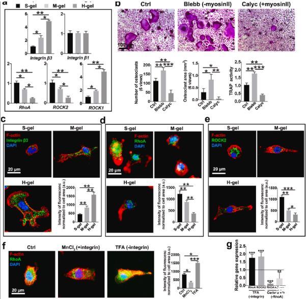 圖2、H-gel促進(jìn)整合素β3表達(dá)并減弱RhoA信號傳導(dǎo)。(a)指定水凝膠上的相對機(jī)械轉(zhuǎn)導(dǎo)mRNA表達(dá)(n=3)。(b)M-gel組培養(yǎng)的破骨細(xì)胞的代表性TRAP染色圖像。對破骨細(xì)胞數(shù)量(n=6)、破骨細(xì)胞面積(n=6)和TRAP活性(n=3)進(jìn)行量化。Blebb:用blebbistatin培養(yǎng)細(xì)胞以抑制肌球蛋白II活性。Calyc:用花萼蛋白A處理細(xì)胞以激活肌球蛋白II活性。(c)具有不同硬度的水凝膠上RANKL刺激的細(xì)胞中F-肌動蛋白(紅色)、整合素β3(綠色)和細(xì)胞核(藍(lán)色)熒光染色的代表性圖像(n=6)。(d)RANKL刺激細(xì)胞在所示水凝膠上染色的F-肌動蛋白(紅色)、RhoA(綠色)和細(xì)胞核(藍(lán)色)的熒光顯微照片和分析。(e)在不同硬度的水凝膠上孵育BMM 3天后,用F-肌動蛋白(紅色)、ROCK2(綠色)和細(xì)胞核(藍(lán)色)染色的細(xì)胞的代表性免疫熒光圖像和分析(n=6)。(f)F-肌動蛋白(紅色)、RhoA(綠色)和細(xì)胞核(藍(lán)色)的免疫熒光染色和分析。將細(xì)胞在96孔玻璃板上孵育。氯化錳2、整合素激活劑。TFA,整合素抑制劑。(n=6)。(g)用所示抑制劑處理后RhoA和ROCK2的相對基因表達(dá)。