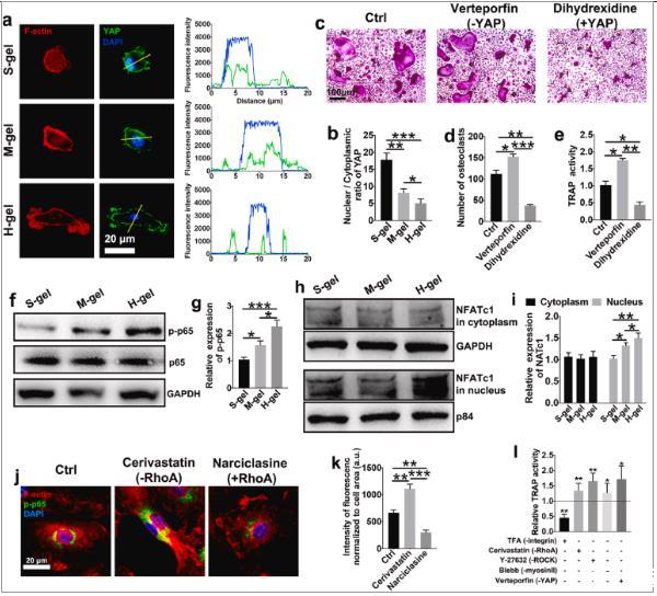 圖3、H-gel損害機(jī)械感應(yīng),從而促進(jìn)NF-κB信號傳導(dǎo)。(a)YAP(綠色)、F-肌動蛋白(紅色)和細(xì)胞核(藍(lán)色)染色的代表性免疫熒光顯微照片。線圖顯示黃色箭頭指示的區(qū)域的YAP和DAPI共定位。(b)YAP核定位通過核/細(xì)胞質(zhì)熒光強(qiáng)度的比率來測量。(n=6)。(c)用維替泊芬(YAP抑制劑)或二羥西定(YAP激動劑)處理的破骨細(xì)胞的代表性TRAP染色圖像。細(xì)胞在M-gel組上孵育。(d)量化與指定試劑一起孵育的破骨細(xì)胞的數(shù)量。(e)測量TRAP活性。(f)在RANKL存在下在所示水凝膠上孵育15分鐘后,對單核細(xì)胞/巨噬細(xì)胞磷酸化p65的相對水平進(jìn)行蛋白質(zhì)印跡分析。(g)p-p65水平與總p65水平的量化(n=3)。(h)檢測細(xì)胞質(zhì)(GAPDH作為細(xì)胞質(zhì)加載對照)和細(xì)胞核(p84作為核加載對照)中的NFATc1水平,并(i)進(jìn)行定量(n=3)。(j)RANKL刺激的BMM中F-肌動蛋白(紅色)、p-p65(綠色)和細(xì)胞核(藍(lán)色)的代表性免疫熒光染色。西立伐他汀,RhoA抑制劑。水仙環(huán)素,RhoA激活劑。(k)p-p65熒光強(qiáng)度的量化,標(biāo)準(zhǔn)化為細(xì)胞大小(n=6)。(l)在H-gel上與M-CSF和RANKL一起孵育3天后,用所示抑制劑處理細(xì)胞過夜,然后進(jìn)行TRAP活性測量。