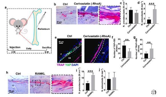 圖4、抑制力傳導(dǎo)促進(jìn)骨膜上破骨細(xì)胞的生成。(a)骨膜注射西立伐他汀和RANKL的圖示。治療1周后,取出股骨并用TRAP和YAP染色以評估力轉(zhuǎn)導(dǎo)和破骨細(xì)胞發(fā)育。(b)代表性TRAP染色圖像,右圖顯示西立伐他汀組中黑色輪廓區(qū)域的放大。(c)骨膜骨表面前破骨細(xì)胞和(d)多核破骨細(xì)胞的定量(n=6)。(e)TRAP(紫色)、YAP(綠色)和DAPI(藍(lán)色)的代表性免疫染色圖像。CB和P代表皮質(zhì)骨和骨膜。(f)骨膜上YAP+細(xì)胞的數(shù)量(n=6)。(g)TRAP+的數(shù)量骨膜上的細(xì)胞(n=6)。(h)RANKL處理的骨膜的TRAP染色圖像,右圖顯示RANKL組中黑色輪廓區(qū)域的放大。(i)骨膜骨表面上的前破骨細(xì)胞和(j)破骨細(xì)胞的定量(n=6)。P和C分別代表骨膜和皮質(zhì)骨。