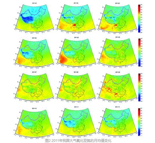 在利用驗證結果完善反演算法的基礎上,開展了我國氧化亞氮濃度的時空變化反演分析。如圖2所示為2011年我國氧化亞氮濃度的月均值分布圖,時空分布顯示,我國氧化亞氮濃度月度間變化比較明顯,從1月份開始,氧化亞氮濃度逐月遞增,8月份最高,之后逐月遞減。