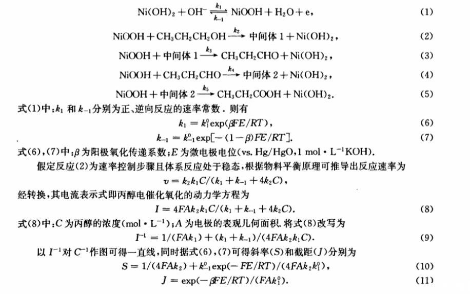 黃令等采用現場紅外反射技術,發現高擇優取向(220)鎳電極對堿液中乙醇的電催化氧化時,乙醇的氧化經過一系列中間過程后被氧化為乙酸。假定Ni-B非晶態合金納米粉末微電極上丙醇的電氧化