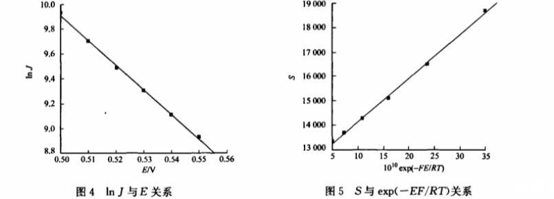 根據圖3求算的不同電位E下的lnJ與E關系,如圖4所示。從圖4可知,兩者呈現較好的線性關系,其斜率為~19.88,截距19.85,根據式(12)可求得β=0.511,=3.16×10-10s-1.又據圖3求算出各直線斜率S與exp(~EF/RT)的關系,如圖5所示。從圖5可知,兩者呈現較好的線性關系,其斜率為1.79×1012,截距12329,根據式(10)可求得k2=2.68×10-4L·(mol·s)~1,k0-1=0.0459s-1。