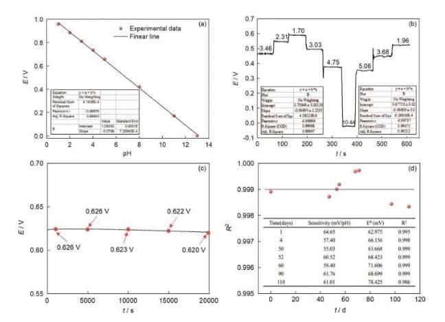 通過在直徑10μm鉑超微電極表面電化學(xué)沉積一層氧化銥薄膜,獲得具有pH響應(yīng)的全固態(tài)鉑/氧化銥(Pt/IrOx)電化學(xué)微傳感器,分析了其線性響應(yīng)、瞬時響應(yīng)、穩(wěn)定性和抗典型離子干擾能力。結(jié)果表明,制備的Pt/IrOx-pH微傳感器電極在pH=1.00~13.00的范圍內(nèi)呈現(xiàn)優(yōu)異的線性響應(yīng)性能(R2=0.999);在短期(20000 s內(nèi))和長期(110 d內(nèi))均具有較高的穩(wěn)定性;在溶液pH發(fā)生變化時,Pt/IrOx-pH傳感器電位能瞬間響應(yīng);在溶液中加入Fe2+、Cu2+和Cl-時,線性響應(yīng)不變,抗干擾能力強,但Ti3+的存在會影響檢測的準確性。