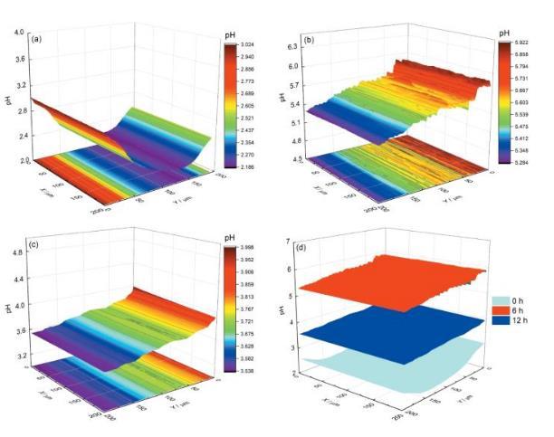 進一步將制備的Pt/IrOx-pH超微傳感器電極應(yīng)用于銅和304不銹鋼在pH=2.00的3.5%NaCl溶液中電偶腐蝕行為研究,SECM面掃描和線掃描結(jié)果結(jié)合OCP的變化,表明Cu和304 SS在開始發(fā)生電偶腐蝕時,Cu為陰極,304不銹鋼為陽極,而當浸泡至12 h時,發(fā)生陰陽極極性反轉(zhuǎn),此時Cu為陽極,而304不銹鋼為陰極,且Cu表面pH更低。