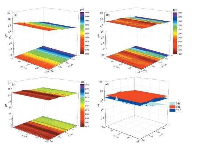 (2)基于SECM的電位模式,結(jié)合ISET,實現(xiàn)了Cu和304不銹鋼偶接前后表面pH的原位高分辨監(jiān)測。在偶接后,Cu表面pH逐漸降低,而304不銹鋼表面pH逐漸增加,結(jié)合OCP的變化發(fā)現(xiàn)在Cu/304不銹鋼電偶腐蝕過程中發(fā)生了陰陽極極性變化,Cu由開始腐蝕時的陰極轉(zhuǎn)變?yōu)殛枠O,相反,304不銹鋼由陽極轉(zhuǎn)變?yōu)殛帢O。