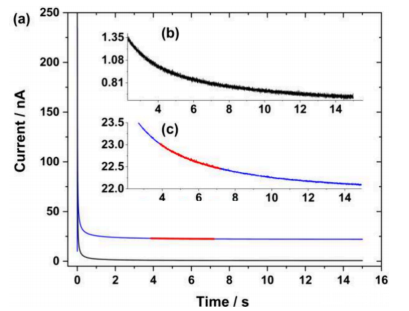 圖3。a)當電極從0.0 V步進到+1.1 V時,在3mmol L?1抗壞血酸+0.1 mol L?1 KCl溶液中進行計時電流測定。黑線對應于記錄在支撐電解質中的背景電流。插圖:b)背景電流的放大倍數,c)用于導出D和c的電流區域(紅色)的放大倍數。