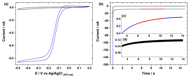 圖2。a)半徑為14.1μm的碳纖維圓盤微電極在1.8 mmol L?1六胺酸(III)+0.1 mol L?1 KCl溶液中記錄的伏安圖。掃描速率=20mv s?1。黑線對應于在支撐電解質中記錄的背景CV。b)同一微電極在同一溶液中從0.0 V步進到?0.4 V時記錄的時程電流圖。插圖:c)用于推導D和c的電流區域(紅色)的放大倍數,D)背景電流的放大倍數。