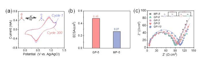 圖4:MWCNT-g-P(TMPMA-co-TMA)的電化學表征。(a)MWCNT-g-P(TMPMA-co-TMA)電極的循環伏安曲線;(b)接枝和混合態P(TMPMA-co-TMA)電極的ECSA比較;(c)MWCNT-g-P(TMPMA-co-TMA)電極在不同P(TMPMA-co-TMA)接枝厚度下的EIS曲線。