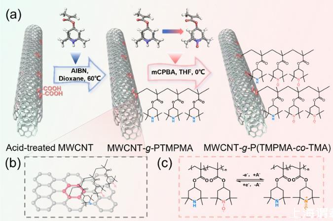 圖1:(a)MWCNT-g-P(TMPMA-co-TMA)的合成,包括自由基聚合和氧化步驟;(b)P(TMPMA-co-TMA)共價接枝在MWCNT上的詳細圖;(c)電控制下氮氧化物自由基(N-O?)與氧銨離子(O=N+)的相互轉化。隨后,采用一系列的表征手段評估聚合物的存在狀態以及氧化還原活性。熱重紅外聯用(TG-IR)分析揭示了共聚物在MWCNT上的接枝密度、重量和特征基團。透射電子顯微鏡(TEM)表征則直接觀察到了接枝和物理混合狀態下聚合物形態學的顯著差異。電化學活性表面積(ECSA)測試反映了形態學差異帶來的電化學反應活性的影響。循環伏安法(CV)、電子自旋共振(EPR)和X射線光電子能譜(XPS)測試進一步證明了材料合成過程中N-H被氧化為N-O?,并且在電位調控下,N-O?與+N=O之間發生了相互轉化。