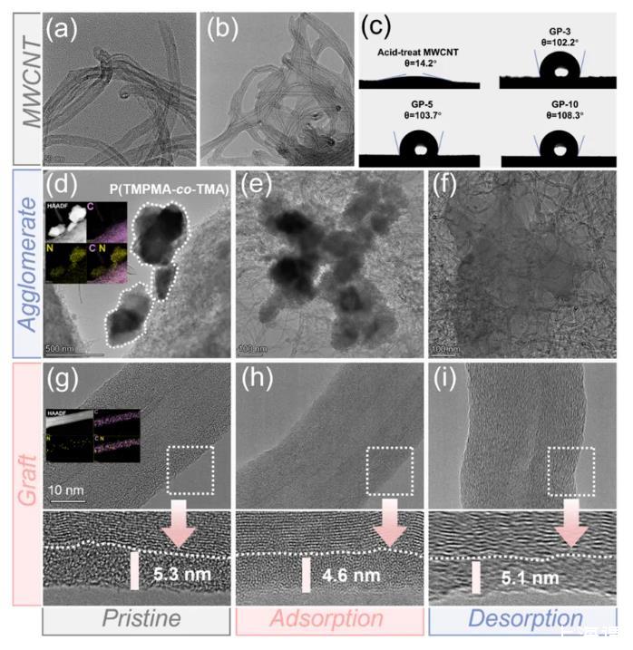 圖3:MWCNT與P(TMPMA-co-TMA)的形貌表征;(a)MWCNT的透射電子顯微鏡(TEM)圖像;(b)接枝P(TMPMA-co-TMA)后MWCNT的TEM圖像;(c)不同接枝量P(TMPMA-co-TMA)的電極表面接觸角;(d-f)聚集態P(TMPMA-co-TMA)吸附與解吸過程的TEM圖像及元素分布圖;(g-i)MWCNT-g-P(TMPMA-co-TMA)吸附與解吸過程的TEM圖像及元素分布圖。
