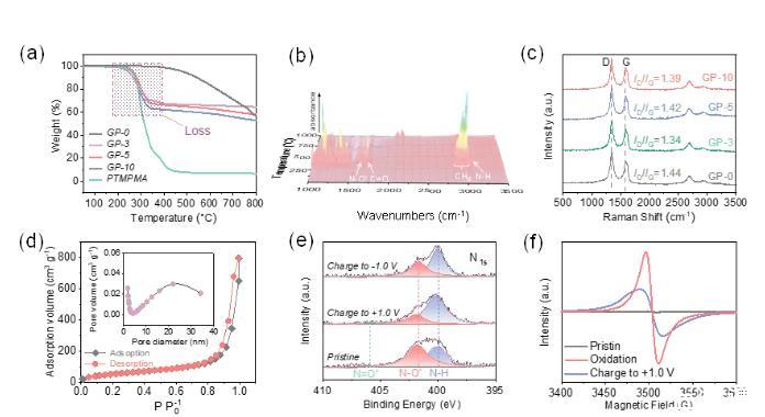 圖2:MWCNT-g-P(TMPMA-co-TMA)的表征。(a)不同接枝量MWCNT-g-P(TMPMA-co-TMA)的熱重分析(TGA)曲線;(b)熱重分析獲得的P(TMPMA-co-TMA)裂解產物的傅里葉變換紅外光譜(FT-IR);(c)原始MWCNT和接枝不同量P(TMPMA-co-TMA)的拉曼光譜;(d)MWCNT-g-P(TMPMA-co-TMA)的氮氣吸附-解吸等溫線;(e)XPS N1s高分辨光譜,顯示通過電化學控制的胺基、氮氧自由基和氨氧離子三種氮狀態;(f)PTMPMA、經mCPBA氧化的P(TMPMA-co-TMA)以及通過電化學控制在1.0 V下由氮氧自由基轉變為氨氧離子的EPR光譜。