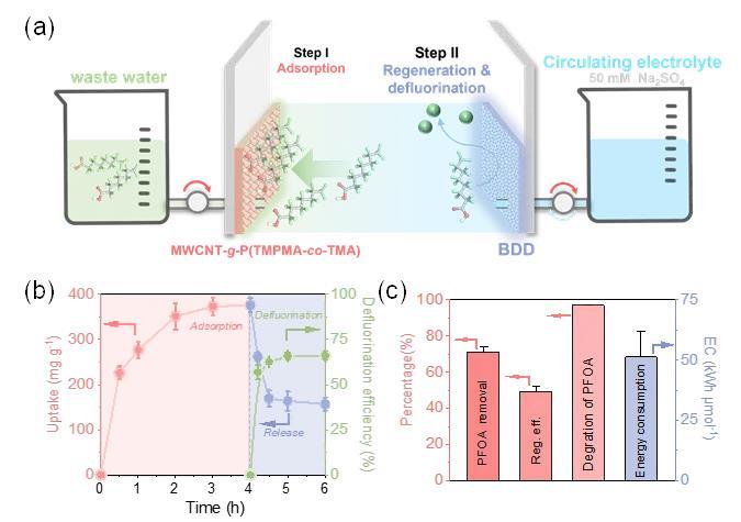 圖7:真實工業廢水處理中電吸附捕獲與轉化。(a)MWCNT-g-P(TMPMA-co-TMA)與BDD點擊耦合用于PFOA的電化學捕獲與轉化的示意圖(再生與脫氟過程在含50 mM Na2SO4的溶液中進行);(b)在不對稱的MWCNT-g-P(TMPMA-co-TMA)||BDD裝置中,工業廢水處理過程中PFOA的累積量與脫氟效率的變化(吸附與再生過程中);(c)工業廢水處理中的PFOA去除率、再生率、脫氟效率與能耗。‘’