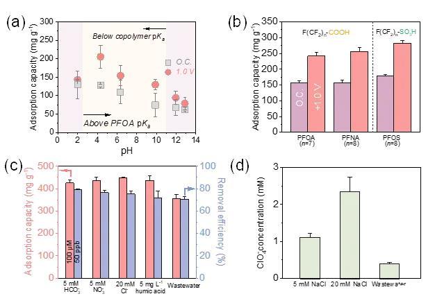 隨后,對接枝聚合物的吸附性能進行了評估。在100μM PFOA和20 mM NaCl共存的溶液中,在施加1.0 V的電壓下進行0.5小時的吸附試驗。結果表明,MWCNT-g-P(TMPMA-co-TMA)共聚物相對Cl-的分離系數為223.7,對應的吸附量達到240.95 mg g?1,顯著高于純MWCNT的70.53 mg g?1。在循環測試中,聚合物電極的吸附容量保持在200mg g?1左右,且再生率維持在80%。此外,本研究還探究了pH,不同頭基PFAS和PFAS濃度對吸附性能的影響,結果表明聚合物電極表現出了較好的適應性。