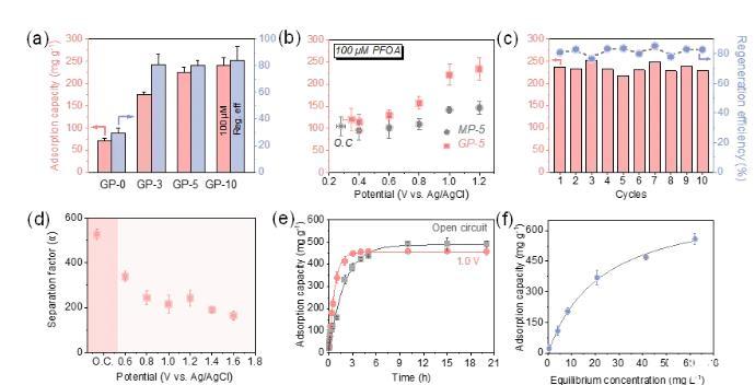圖5:氧化還原共聚物電極的吸附與解吸性能。(a)不同接枝含量MWCNT-g-P(TMPMA-co-TMA)的PFOA吸附容量和再生效率;(b)不同電位下的吸附容量比較(在20 mM NaCl和100μM PFOA中測試);(c)MWCNT-g-P(TMPMA-co-TMA)10個循環中的PFOA吸附容量和再生效率;(d)不同電位下聚合物電極對PFOA與Cl?的分離因子;(e)在開路電位和1.0 V下PFOA的吸附動力學;(f)電吸附等溫線。