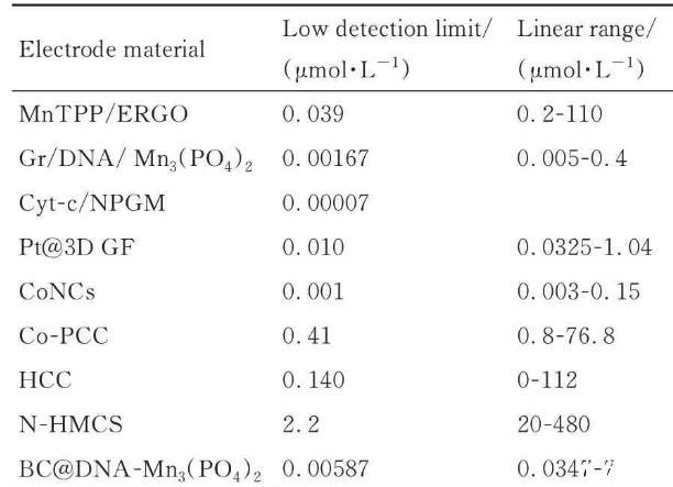 在各類納米金屬與不同材料相結合的功能結合型材料中,除了金屬框架的MOF外,碳基金屬材料的導電性能也非常優異。Zhang等將一維金納米粒子(AuNPs)組裝在磁性氮摻雜碳納米管(NCNTs)上,再與細胞色素c(Cyt-c)結合制備出基于Cyt-c/NCNTs Fe3O4 Au的傳感器。其引入的AuNPs不僅不會破壞Cyt-c的天然結構,還能增強Cyt-c在電極表面的電催化特性。該傳感器用于檢測H2O2,其檢測限低至0.3μmol/L。