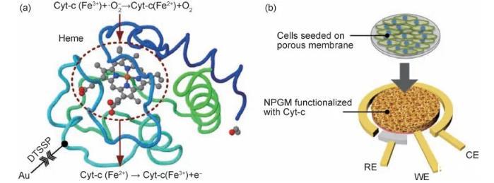 圖3細胞外超氧化物的電化學檢測(a)通過氧化還原蛋白(Cyt-c)與電極之間的氧化和直接電子轉移來實現的傳感機制;(b)細胞被界面連接功能化電極示意圖