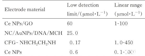 在活性氧檢測領域,對·OH的檢測相對偏少,這是因為·OH具有較高的化學反應性,壽命極短(在生物系統中約為15 s),且難以在模型系統中進行檢測并研究其與DNA損傷的關系。在眾多研究中Ce NPs對·OH具有極高的選擇性,這為·OH的檢測提供了新思路。另外還可以通過直接判斷DNA的損傷程度來檢測·OH濃度或通過·OH捕獲物間接檢測·OH。表28,64,66-6展示了用于·OH檢測的不同修飾電極的性能比較。