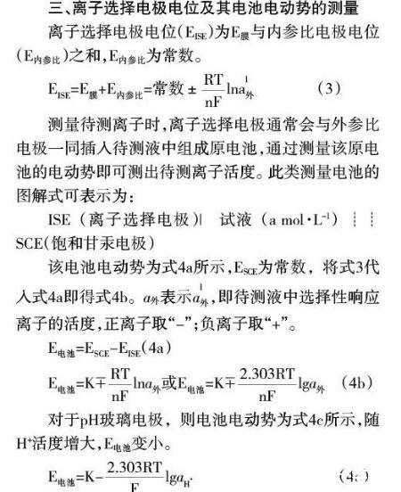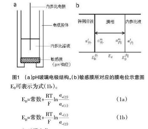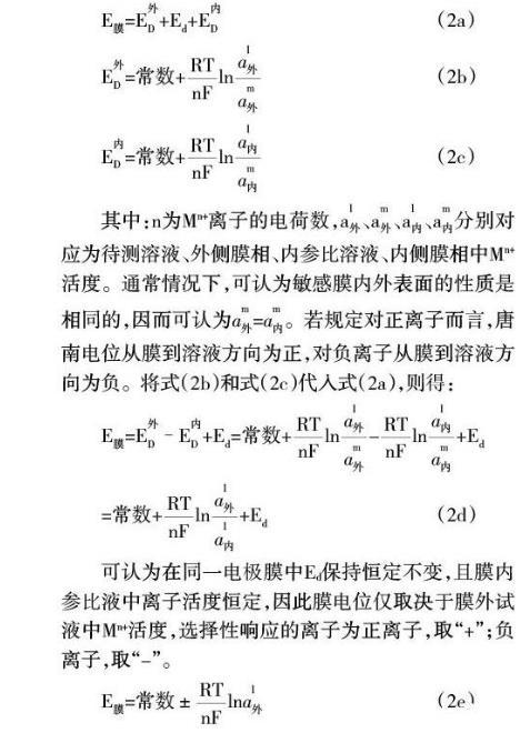 離子選擇電極(如pH玻璃電極)膜電位是由膜相中的擴(kuò)散電位和膜內(nèi)外兩個界面上的界面電位(或唐南電位)的代數(shù)和(圖1b)。