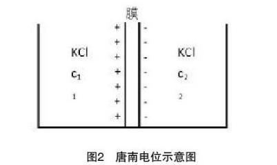 唐南電位由強(qiáng)制性和選擇性擴(kuò)散所形成,如圖2所示建立的模型中,假定圖中滲透膜只允許K+通過(C2>C1),從而因電荷分布的不均勻?qū)е略谀蓚?cè)界面上產(chǎn)生雙電層結(jié)構(gòu)而形成電位差,即為唐南電位(ED)。對于1∶1型電解質(zhì),ED可表示為式(1a);若滲透膜只允許負(fù)離子擴(kuò)散通過,對1∶1型電解質(zhì)而言,則ED可表示為式(1b)。