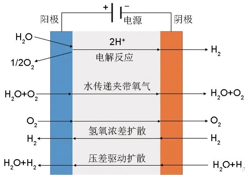 圖3質子交換膜電解水發生氫氧互串的機制示意圖