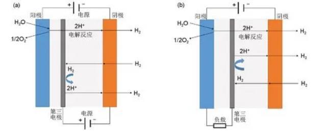 通過電化學搬運的方法也可以有效降低陰極氫氣透過隔膜向陽極的滲漏通量,如圖4所示。在陽極和陰極之間構造了第三電極用于催化氫氧化反應,在該電極上施加相對于陰極約100 mV的電位能夠形成電化學氫泵回路,使得從陰極向陽極滲漏的氫氣發生電氧化后以質子的形式傳遞回陰極;在第三電極和陽極間增加負載則形成燃料電池回路,使得從陰極向陽極滲漏的氫氣發生電氧化后以質子的形式傳遞至陽極。然而,這種方法造成隔膜增厚,且第三電極阻礙質子傳導,使得電解過程的歐姆阻抗增加,電解電壓升高,效率下降。