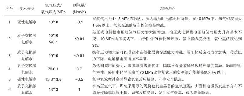 電解水制取高壓氫氣通過電化學的方法對生產的氫氣直接增壓,壓縮效率高,輸出的高壓氫氣更易直接轉存或應用,有利于制氫工藝流程提高集成度,降低運維成本,對于提高電解水制氫綜合經濟性具有重要意義,但面臨電解槽氣密性、關鍵材料氫相容性以及氫氧互混管理等方面的技術挑戰。