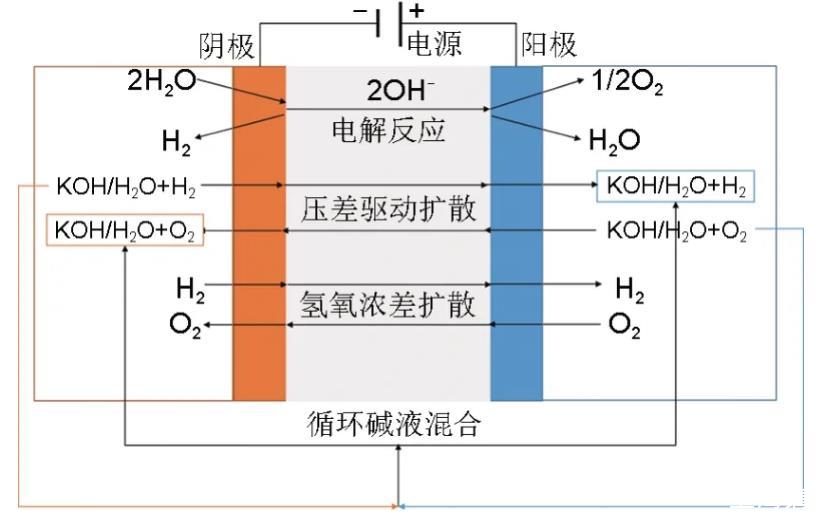 管控氫氧互混是保障電解水制取高壓氫氣安全性和高效率的關鍵,質子交換膜電解水陰極氫氣透過隔膜向陽極滲漏導致氧中氫濃度提高,通過陽極氫氧化或電化學氫泵能夠抑制氧中氫含量,但無法提高電流效率,開發氣密性好、強度高、離子電導高的質子交換膜是關鍵;堿性電解水采用多孔隔膜和流動的液態電解質,需要嚴格控制陰陽極壓差以避免氫氧透過隔膜發生互混,陰陽極出口堿液循環混合過程導致溶解態氫氣和氧氣互混,開發堿液循環新工藝和過程控制策略是管控氧中氫濃度的關鍵。