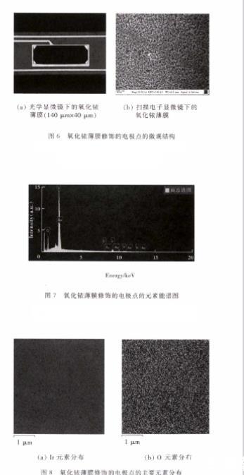 3.1氧化銥薄膜修飾電極點的微觀結構表征使用掃描電子顯微鏡對氧化銥薄膜修飾的電極點進行微觀結構表征。圖6為薄膜修飾的電極點的微觀結構。從圖中可以看出,濺射制備的氧化銥具有條形的褶皺結構,這些褶皺彼此交織,形成很多的隆起和間隙,大大增加了氧化銥薄膜的表面積,非常有利于其與H+的接觸和響應。對氧化銥薄膜修飾的電極點進行元素能譜(EDS)測試。圖7為其元素能譜圖,可以看出其主要元素是I r和0,證實了氧化銥薄膜濺射的成功性。