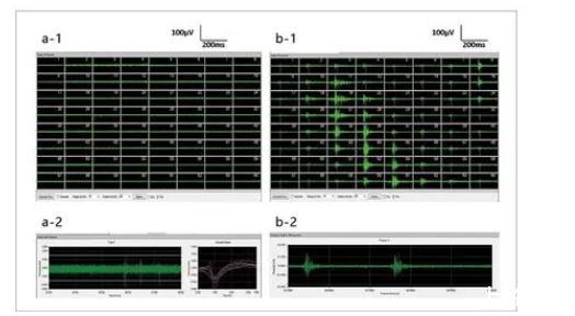 圖2.小鼠海馬腦片放電(a-1.MED64記錄正常小鼠海馬腦片自發放電;a-2.第29通道海馬腦片神經元自發放電;b-1.MED64記錄4AP+無鎂高鉀ACSF誘導的海馬腦片自發性癲癇樣放電;b-2.第27通道海馬腦片神經元癲癇樣放電)