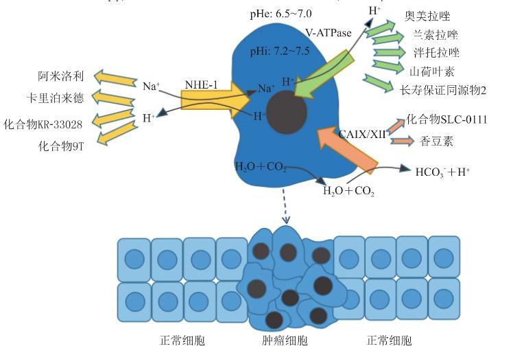 另外,胞內生成的CO2彌散到胞外,腫瘤缺氧的狀態活化了缺氧誘導因子1(HIF-1),誘導腫瘤細胞高表達CA,催化CO2和H2O反應生成碳酸。綜上所述,乳酸和CO2是腫瘤酸性環境產生的兩大物質基礎。腫瘤細胞無法在pHi過低的條件下長期生存,因此必須通過某些機制將酸性產物不斷排出細胞外而維持胞內pH穩定。乳酸產生后,一些氫離子和乳酸根被單羧酸鹽轉運蛋白(monocarboxylate transporter,MCT)以共轉運的方式運輸到細胞外,大部分的氫離子則被細胞膜上眾多激活的離子轉運蛋白運至細胞外或泵入某些細胞器中,最終導致腫瘤細胞在維持胞內pH呈中性至堿性的同時,胞外及胞內一些細胞器(如內涵體、溶酶體)的pH明顯降低。