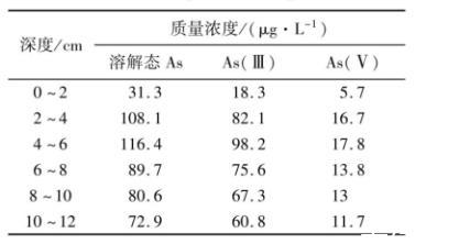 過濾后的湖水水質指標如下:湖水As質量濃度為1.22μg/L,TOC、TN、TP、磷酸根分別為7.43mg/L,0.93mg/L,0.04mg/L,0.02mg/L,pH值為7.57。用離心法得到過篩混勻后分層底泥的間隙水,測定間隙水中溶解態As、As(Ⅲ)和As(Ⅴ)的質量濃度(表1)。