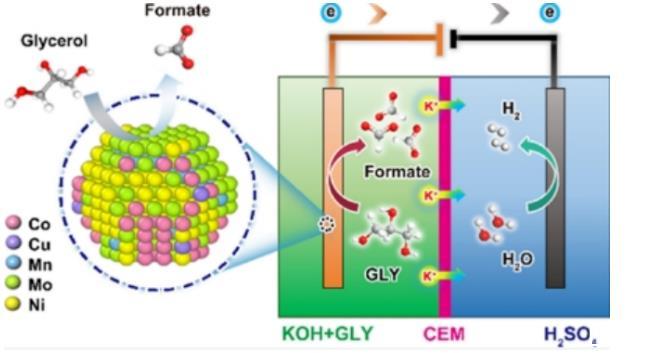 該研究通過在CC上生長CoNiCuMnMo-NPs,為GOR合成了一種自支撐HEA電極。該電極在堿性電解液中對GOR表現出高電催化活性,可以在1.25 V下提供10 mA cm-2的電流密度,并且在很寬的電位范圍內具有超過90%的甲酸鹽FE?;贛L的MC模擬表明催化活性中心是由Mn、Mo和Ni配位的Mo位點。作者設計了混合堿/酸電解槽,以在陽極氧化甘油和在陰極生產H2。由于pH梯度和甘油氧化的共同作用,組裝的電解槽僅需0.55 V的極低電壓即可達到10 mA cm-2的電流密度,并可以持續電解超過12天。該工作不僅為開發先進的甘油氧化電催化劑和設計具有高催化活性的HEA電催化劑提供了思路,而且為開發生產增值化學品的可持續路線提供了一種低成本、節能的途徑。