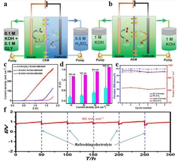 以CoNiCuMnMo-NPs/CC為陽極,1.0 M KOH電解質含0.1 M甘油為陽極,與0.5 M H2SO4陰極的RuIr/Ti商用陰極配對(圖6a),建立了堿/酸混合電解槽。為了比較,我們用1.0 M KOH作為陰極液組裝傳統的堿性電解池(圖6b)。在50 mA cm-2的恒定電流密度下測試了混合堿/酸電解槽的重復性,進行了連續6次循環測試。