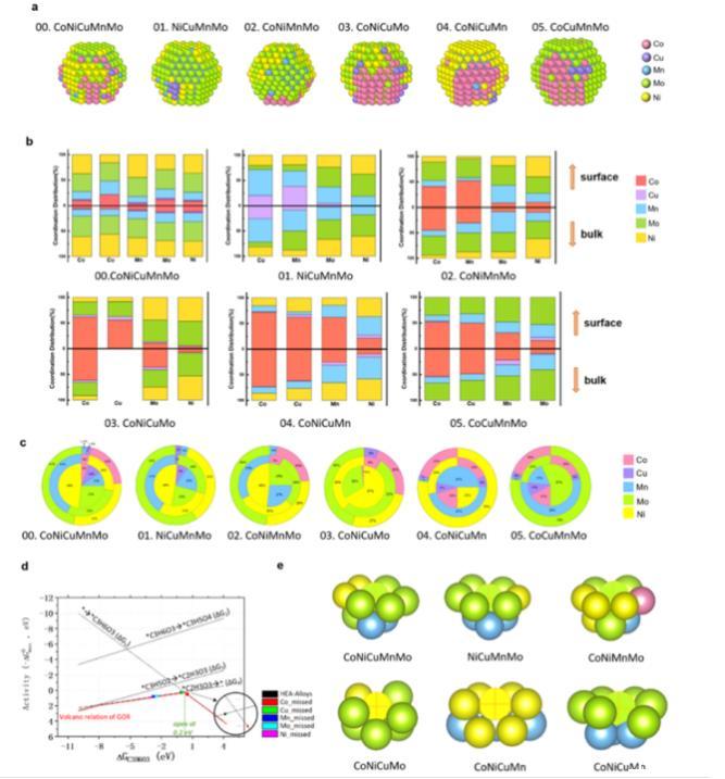 開發了一種算法,可以有效地分析密度泛函理論結果,并通過機器學習將這些結果總結為力場。發現活性位點沿著相邊界線定位,因此通過富集Mo、Ni和Mn元素來提高HEA-NPs的活性是一種簡單而有效的策略。