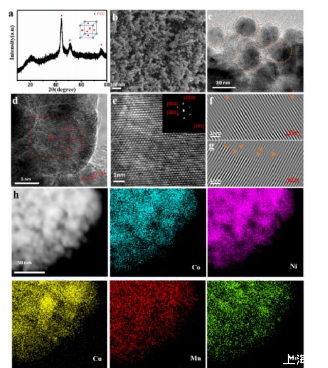 圖1 CoNiCuMnMo-NPs的(a)XRD圖、(b)SEM和(c)HRTEM圖。(d)CoNiCuMnMo-NPs的明場TEM圖像,顯示了HEA NPs在低倍鏡下的分散情況。(e)顯示B區域原子晶格的HRTEM圖像(插圖:FFT圖案)。沿(f)(202)和(g)(022)晶格平面成像的區域B的原子晶格圖像。(h)CoNiCuMnMo-NPs的Co、Ni、Cu、Mn和Mo的EDS元素mapping圖像。