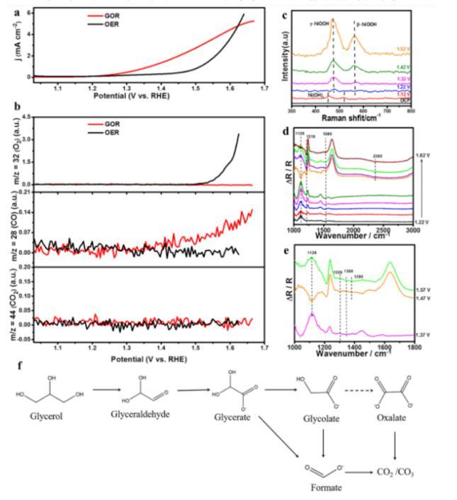 圖3.(a)在1 M KOH電解質中添加或不添加甘油的情況下,在催化劑改性的GCE上,在LSV測試中的EC-MS實驗(1.6 V vs RHE后的甘油氧化由于封閉系統而受到傳質的嚴重限制)。(b)上圖顯示m/z=32的信號和O2釋放的質量活性,中圖顯示m/z=28的信號和CO釋放的質量活性,下圖顯示m/z=44和CO2釋放的質量活性。(c)CoNiCuMnMo-NPs在各種工作電位下的原位拉曼光譜。(d,e)CoNiCuMnMo-NPs在1 M KOH和0.1 M甘油中,不同工作電位下的原位ATR-IR光譜(100次掃描,分辨率4 cm–1)。(f)堿性介質中甘油氧化反應可能的途徑。