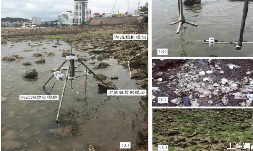 圖2(A)渦動相關系統現場布設情況;(B)測點位置情況;(C)長有貽貝類生物的礫石;(D)長有藻類生物的礫石