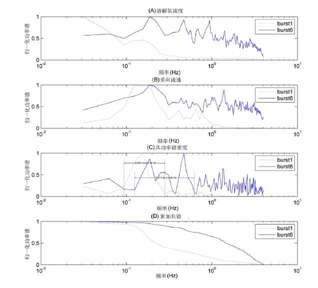 圖8 burst1和burst6功率譜密度計(jì)算結(jié)果(A)溶解氧濃度歸一化功率譜;(B)垂向流速歸一化功率譜;(C)共功率譜密度;(D)累加共譜