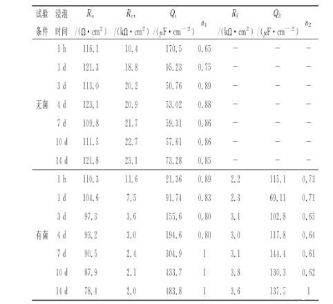 由圖2可見,在無菌介質(zhì)中,黃銅電極的阻抗值隨著浸泡時(shí)間的延長而增大,而在含菌介質(zhì)中,電極阻抗值則隨著浸泡時(shí)間的延長而顯著減小。可用圖3(a)和(b)的等效電路分別來擬合圖2中無菌和含菌體系中電極的電化學(xué)阻抗譜。其中,Rct為電極表面反應(yīng)的電荷轉(zhuǎn)移電阻,Qt為金屬/介質(zhì)表面的雙電層電容,Rf為膜層電阻,Q2為膜層電容。采用Zview軟件進(jìn)行擬合,結(jié)果如表1所示。