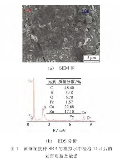 將黃銅掛片浸泡在含菌溶液中14 d,可以發(fā)現(xiàn)掛片表面逐漸被微生物膜所覆蓋。圖1為黃銅試樣在接種SRB的模擬水中浸泡14 d后的表面形貌及EDS能譜分析結(jié)果。由圖1(a)可見,試驗(yàn)所用的脫硫弧菌為2~6μm的略微彎曲的圓筒狀菌,被胞外聚合物以及腐蝕產(chǎn)物包裹附著在金屬表面形成疏松多孔的微生物膜和腐蝕產(chǎn)物膜。