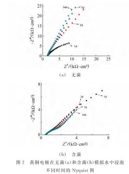 圖2黃銅電極在無菌(a)和含菌(b)模擬水中浸泡不同時(shí)間的Nyquist圖
